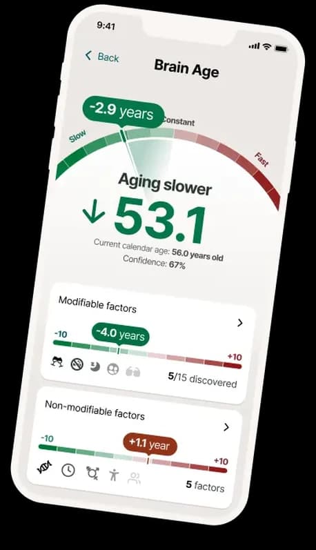 Start with a quick science-based assessment. We analyze your lifestyle, habits, and health data to reveal your current Brain Age.